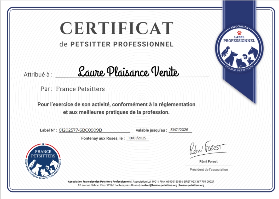 Je m'engage à fournir un service de qualité pour vous permettre de vous détendre et de profiter de votre temps libre sans vous inquiéter pour votre compagnon.